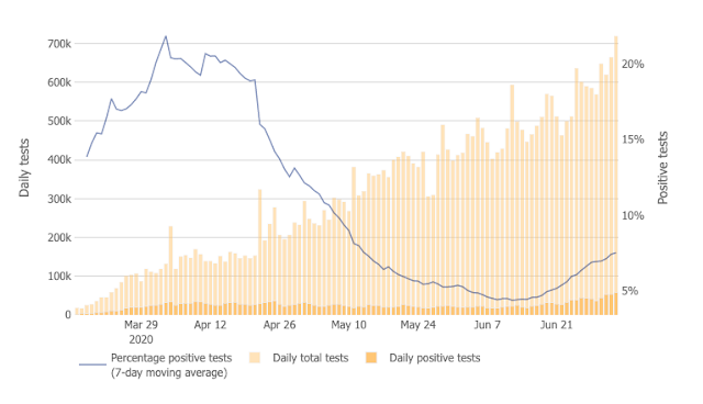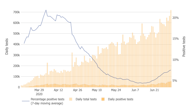 It's simply not true that the eventual increase in testing capacity—which Trump famously said was not his responsibility, but is now taking credit for—accounts for the last month's increase in positive results. The percentage of positive tests (the blue line in the graph below) is increasing, too—and fast.